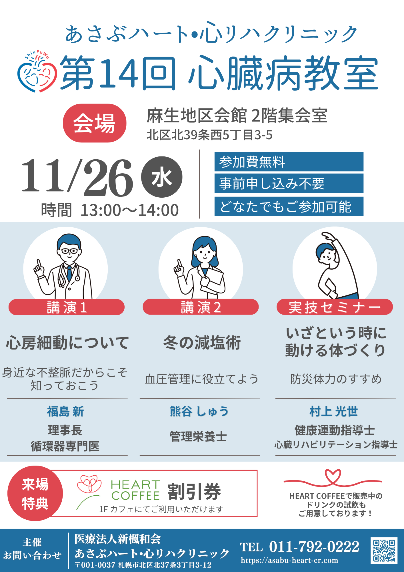 2025.10.28 11月26日(水)第14回心臓病教室のお知らせ 当院で医師・スタッフが麻生地域の住民のために無料で開催しております 市民公開講座「第14回 心臓病教室」を 11月26日(水)13:00~14:00 麻生地区会館(札幌市北区北39条西5丁目3-5)2F会議室 にて行います。 今回の公開講座では、医療法人新楓和会 理事長 循環器専門医:福島新より「心房細動について~身近な不整脈だからこそ知っておこう~」と題して講演いたします。 また、あさぶハート・心リハクリニック 管理栄養士:熊谷しゅうより「冬の減塩術~血圧管理に役立てよう~」、最後にあさぶハート・メディカルフィットネス 健康運動指導士 心臓リハビリテーション指導士:村上光世より「いざという時に動ける体づくり~防災体力のすすめ~」と題して講演と健康体操の実技指導を行います。 さらに当日は当院1F HEAET COFFEE より、試飲を無料でご用意しております。講演や体操、カフェの試飲を含めて全て無料で参加可能となっておりますので、ぜひお気軽にご友人、ご家族様などお誘いあわせの上、ご参加ください! < 前の記事へ お知らせ一覧へ >