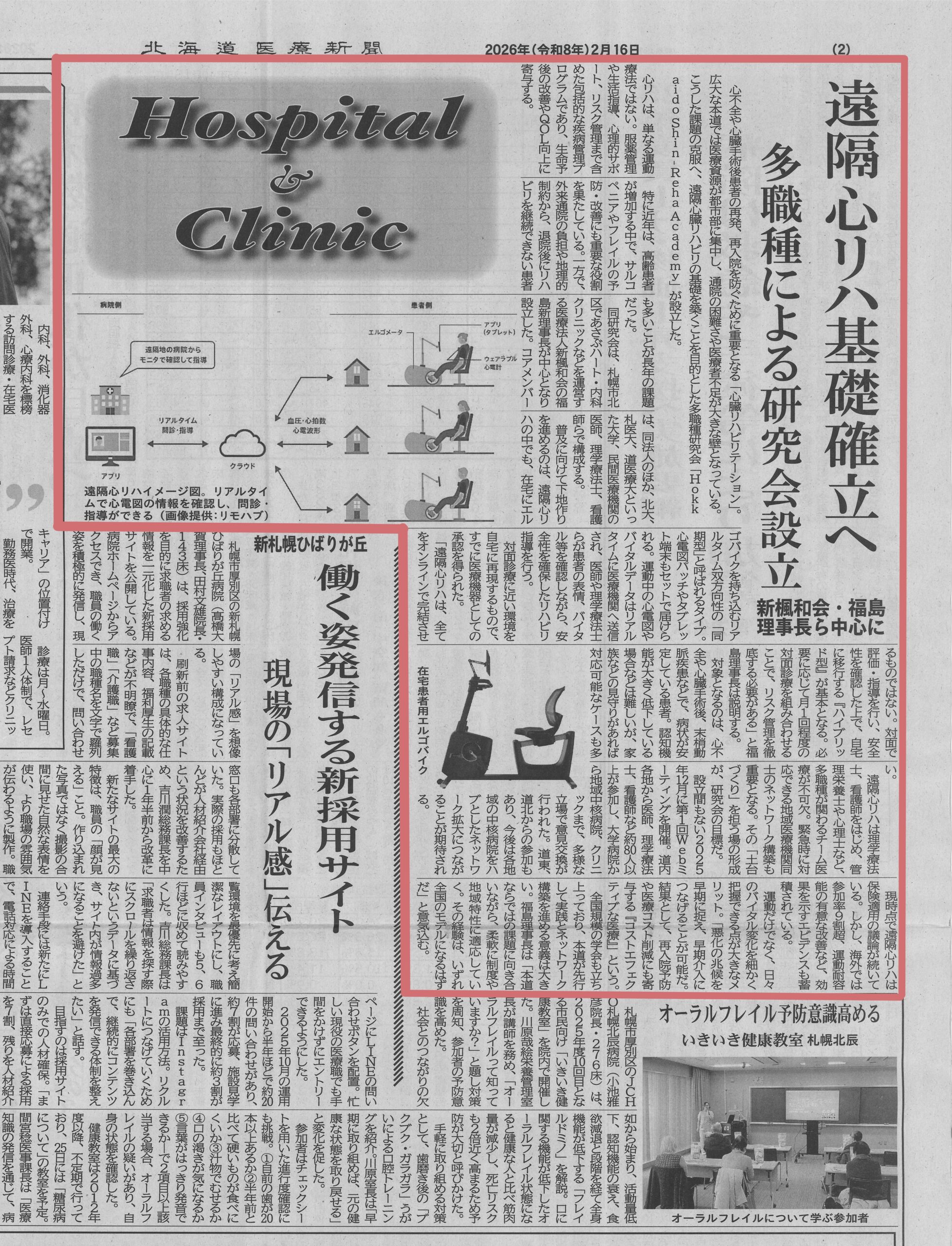 2026年2月16日発行の「北海道医療新聞」にて、当院が中心となって立ち上げた研究会「Hokkaido Shin-Reha Academy(北海道シン・リハ アカデミー)」の活動が、一面トップ記事として大きく掲載されました。