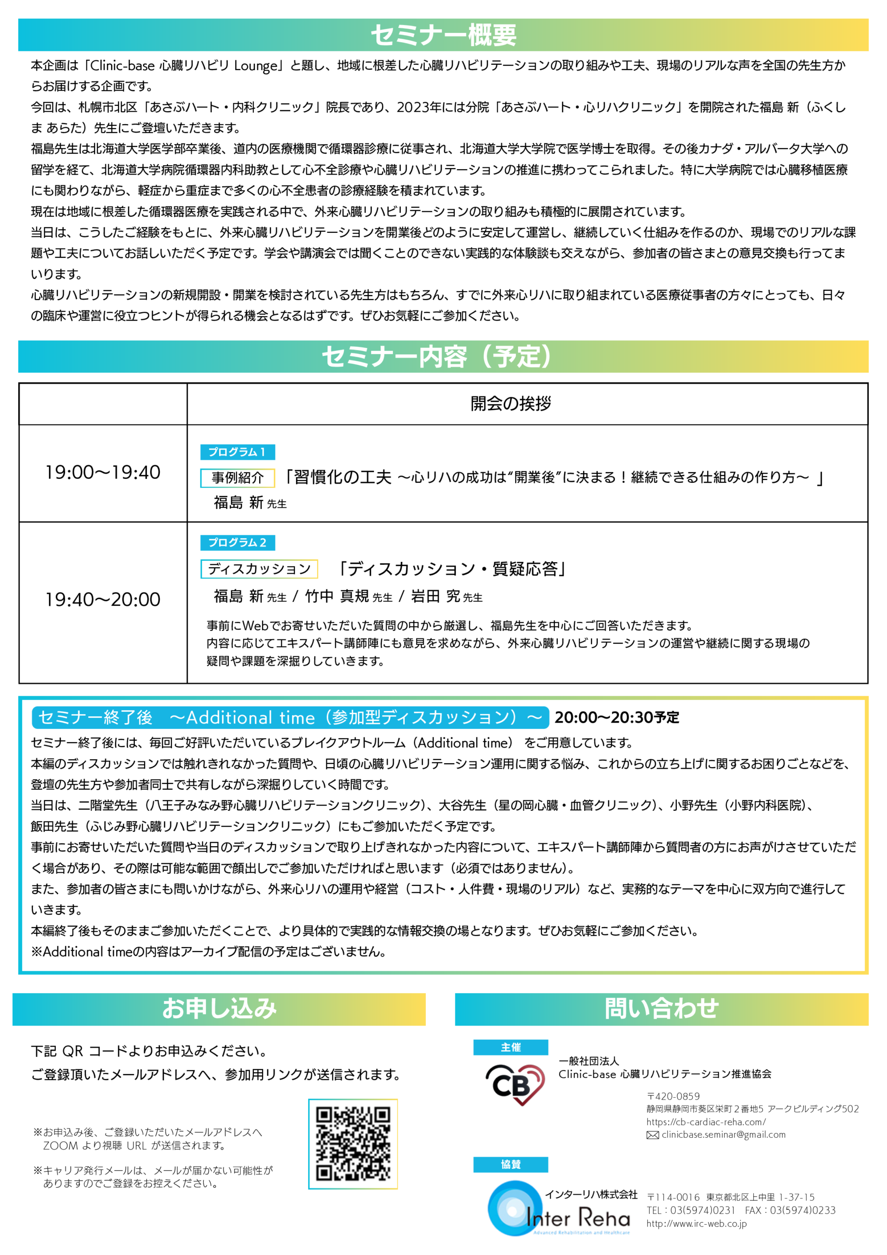 | 主催 | 一般社団法人 Clinic-base 心臓リハビリテーション推進協会 |