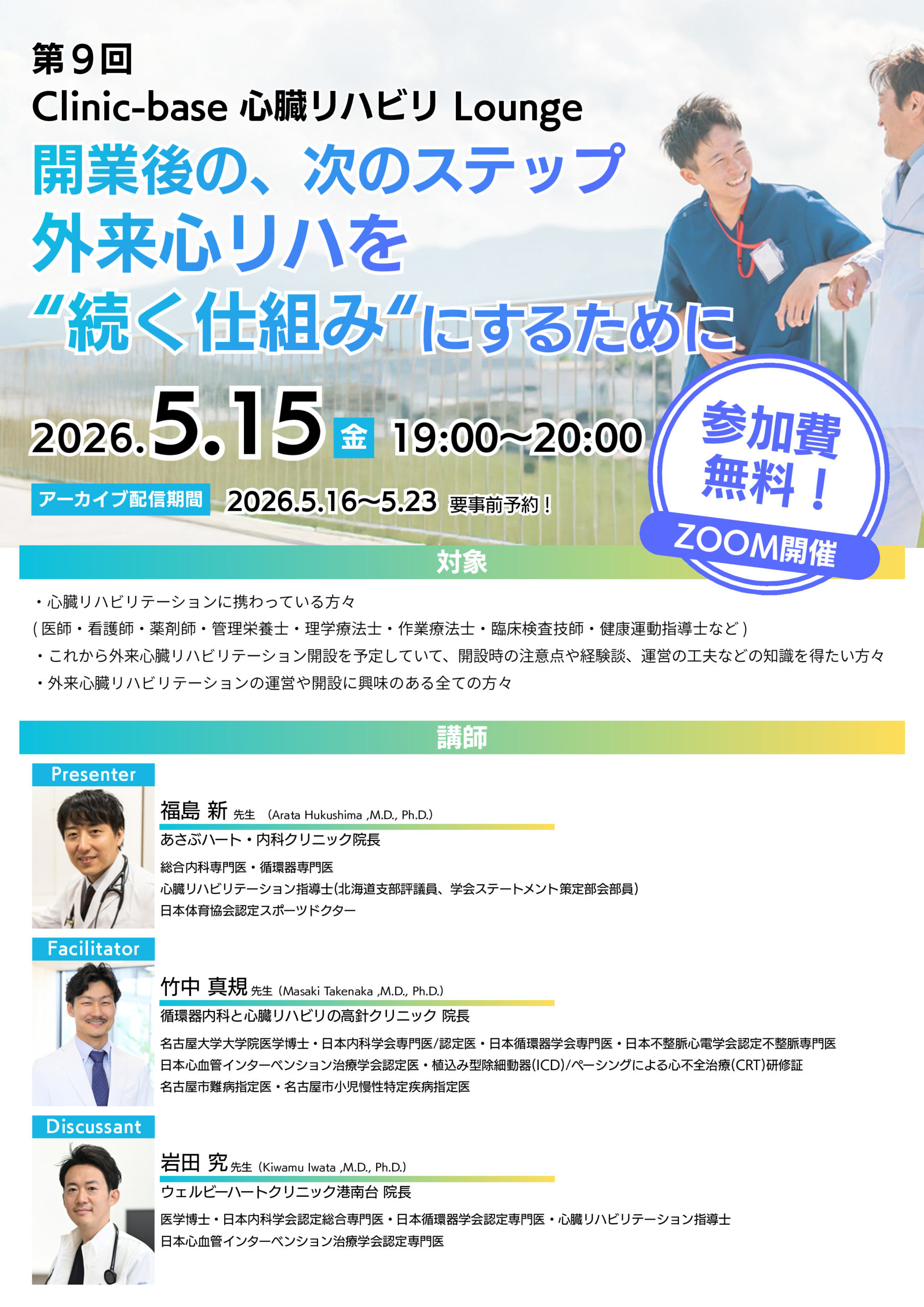 今回のテーマは「開業後の、次のステップ ― 外来心リハを“続く仕組み”にするために」。外来心臓リハビリテーションをいかに安定して継続していくか、という現場の課題に焦点を当てた内容です。